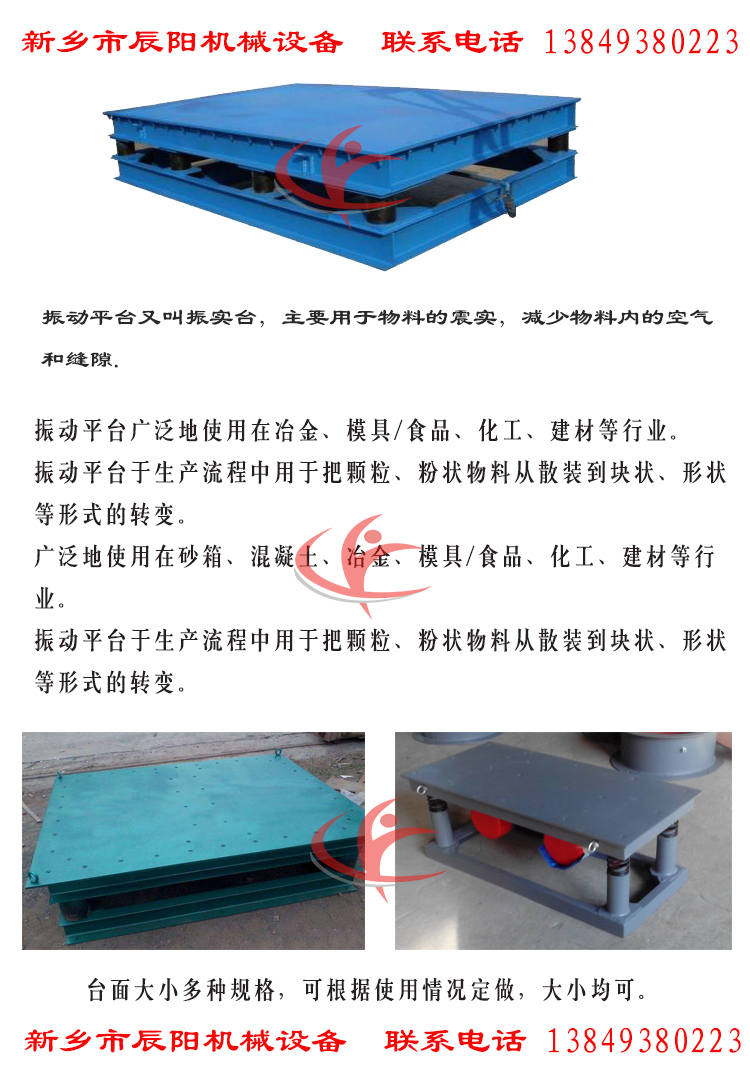 振動(dòng)平臺(tái)又叫振實(shí)臺(tái),主要用于物料的振實(shí),減少物料內(nèi)的空氣和縫隙。振動(dòng)平臺(tái)廣泛使用在預(yù)制件、人防工程門、混泥土、消失模、冶...