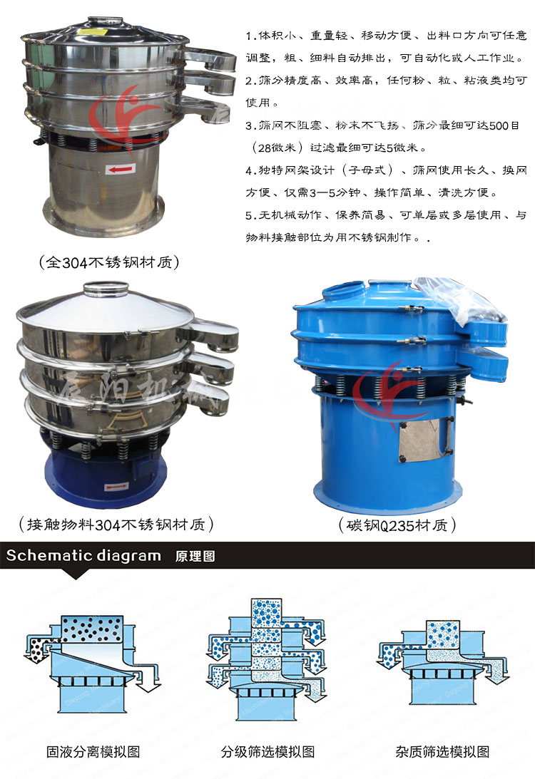 超聲波振動篩是將220v、50HZ或110v、60HZ電能轉(zhuǎn)化為38KHZ的高頻電能,輸入超聲換能器,將其變成38KHZ機械振動,從而達到**篩分和清網(wǎng)的目的。改系統(tǒng)在傳統(tǒng)的振動篩基礎(chǔ)上再篩網(wǎng)上引入一個低振幅、高頻率的超聲波振動波(機械波)在篩網(wǎng)上面疊加一個高頻率低振幅的超聲振動儀,超微細粉體接受巨大的超聲加速度,使篩面上的物料**保持懸浮狀態(tài),從而抑制粘附、摩擦、平降、等堵網(wǎng)因素。解決了強吸附性、易團聚、高靜電、高精細、高密度、輕比重等篩分難題,使超細微粉篩分不再難事,特別適合高品質(zhì)、精細粉體的用戶使用